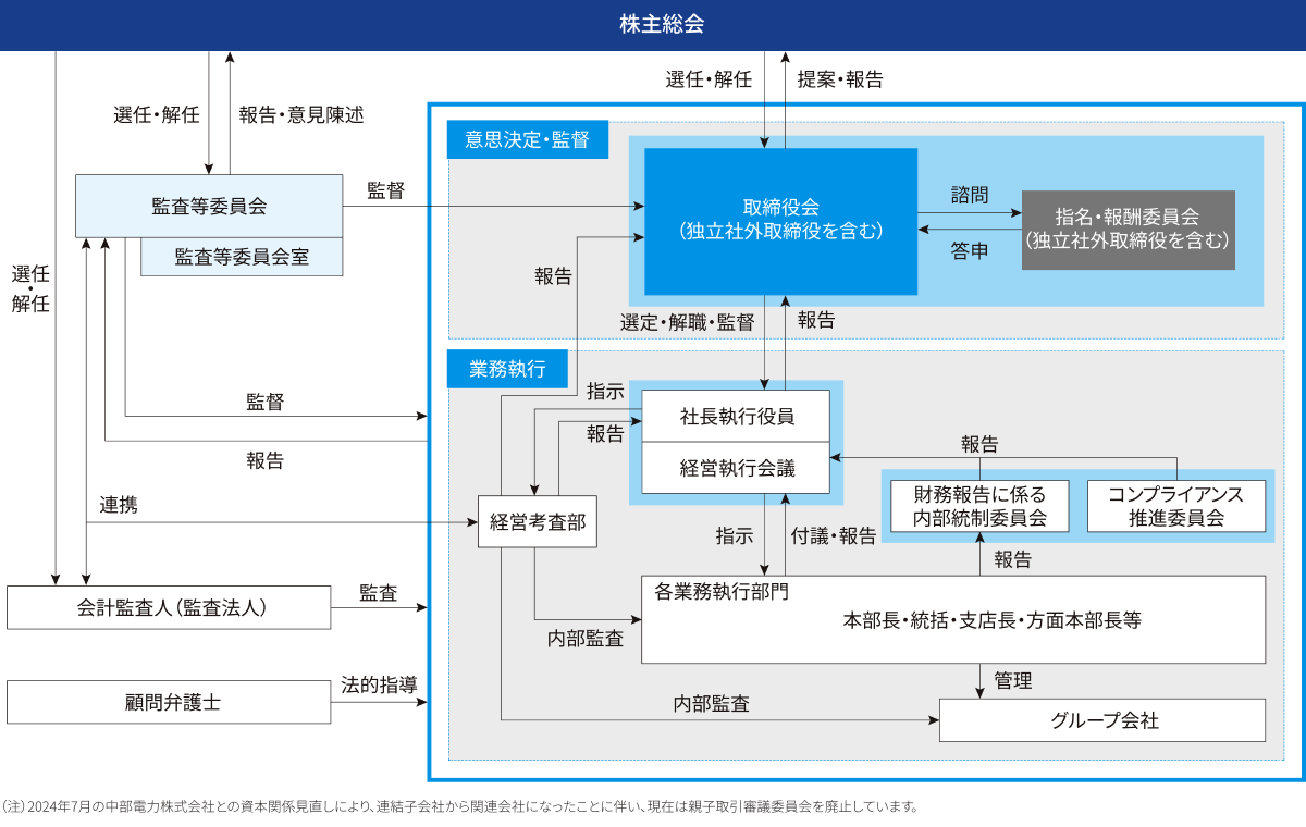 このような考えのもと、コーポレートガバナンス・コードに示された各原則等を踏まえ、企業倫理・コンプライアンスの徹底や、内部統制・リスクマネジメント・情報開示の充実を図り、経営の効率性、公正・透明性を高めることにより、コーポレート・ガバナンスの強化に努めます。